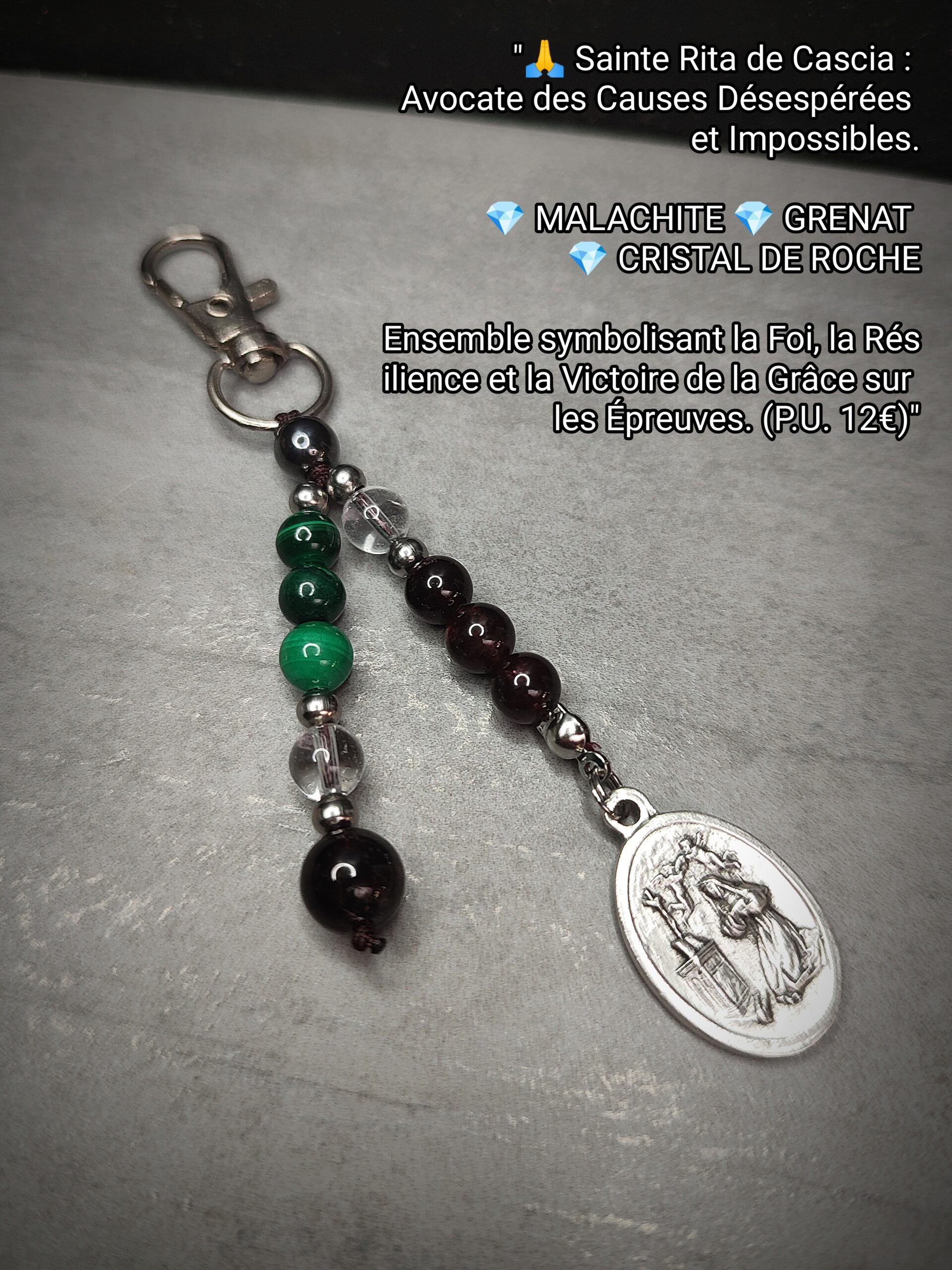 Porte-clés Sainte Rita : Malachite Grenat Cristal de Roche (12€)